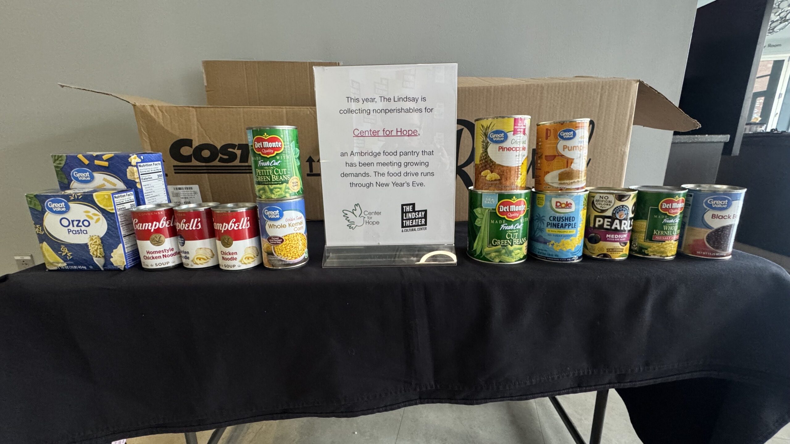 This year, The Lindsay is collecting nonperishables for the food pantry at The Center for Hope, an Ambridge nonprofit that has been meeting growing demands. Through New Year’s Eve, The Lindsay will gather food donations.